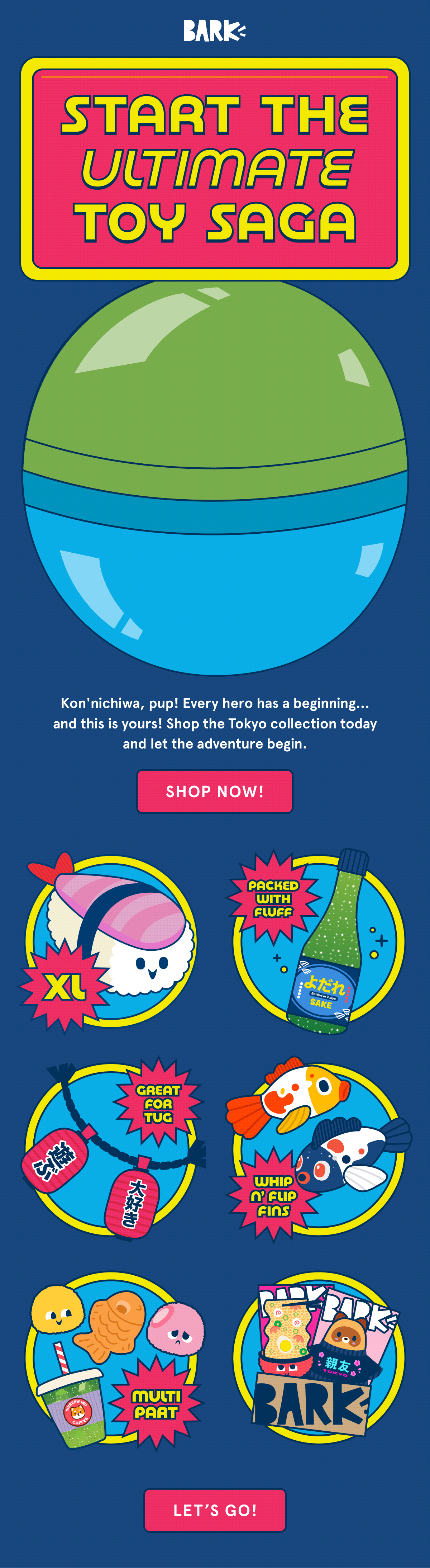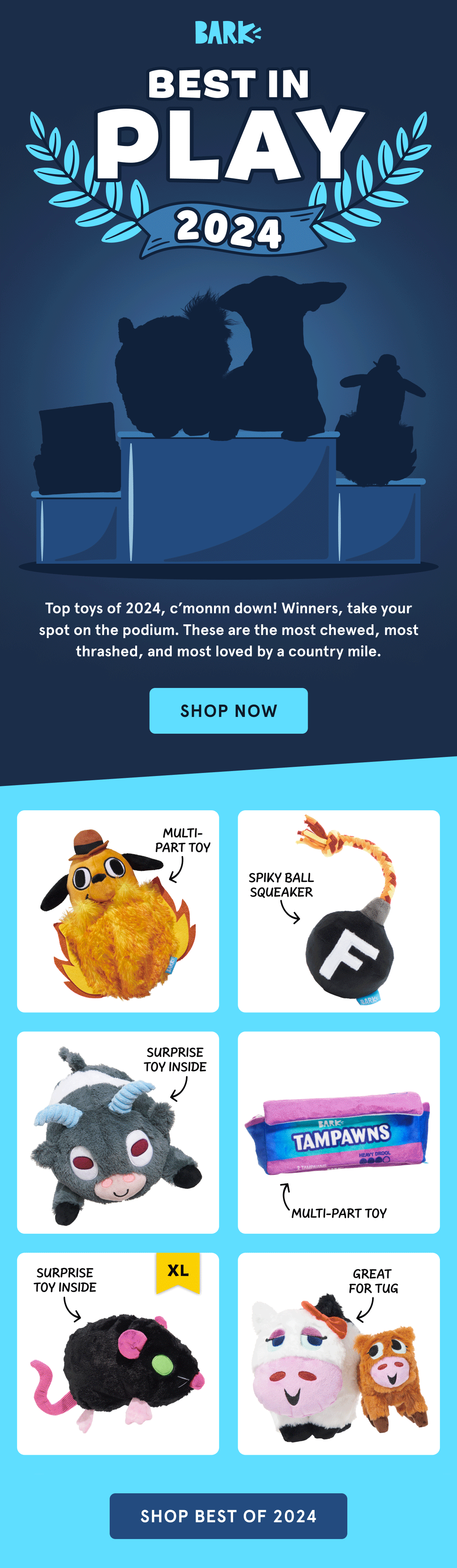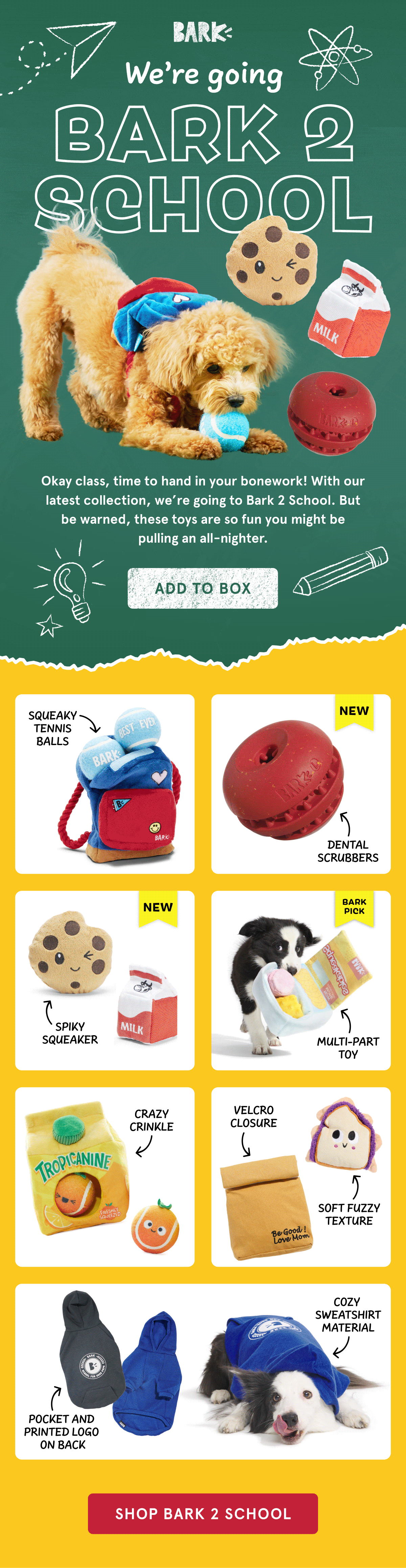 This email collection follows BARK’s standard 'Add to Box' grid layout, featuring themed headers designed with playful typography, bold color, and animated GIFs to capture attention and reinforce the toy line’s concept