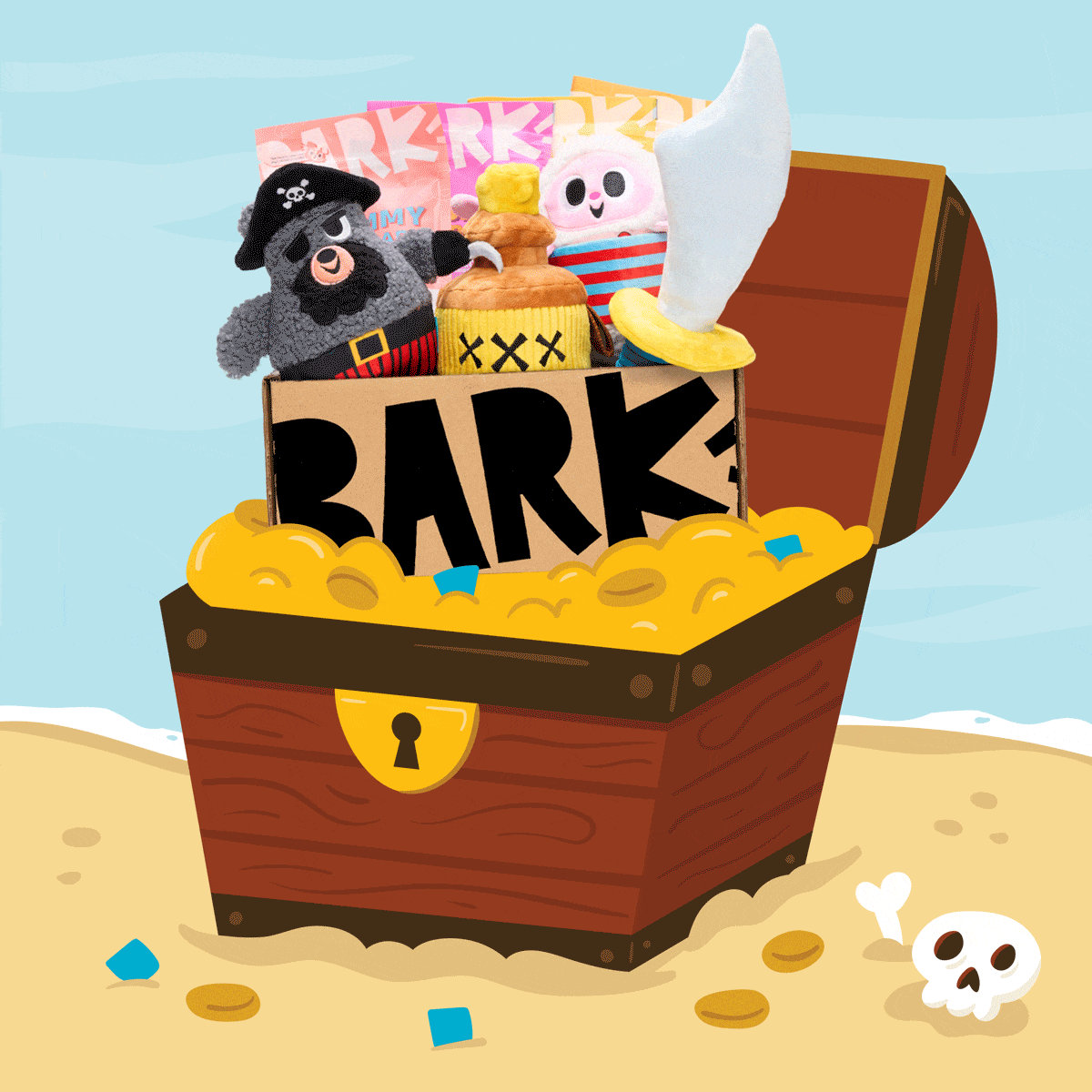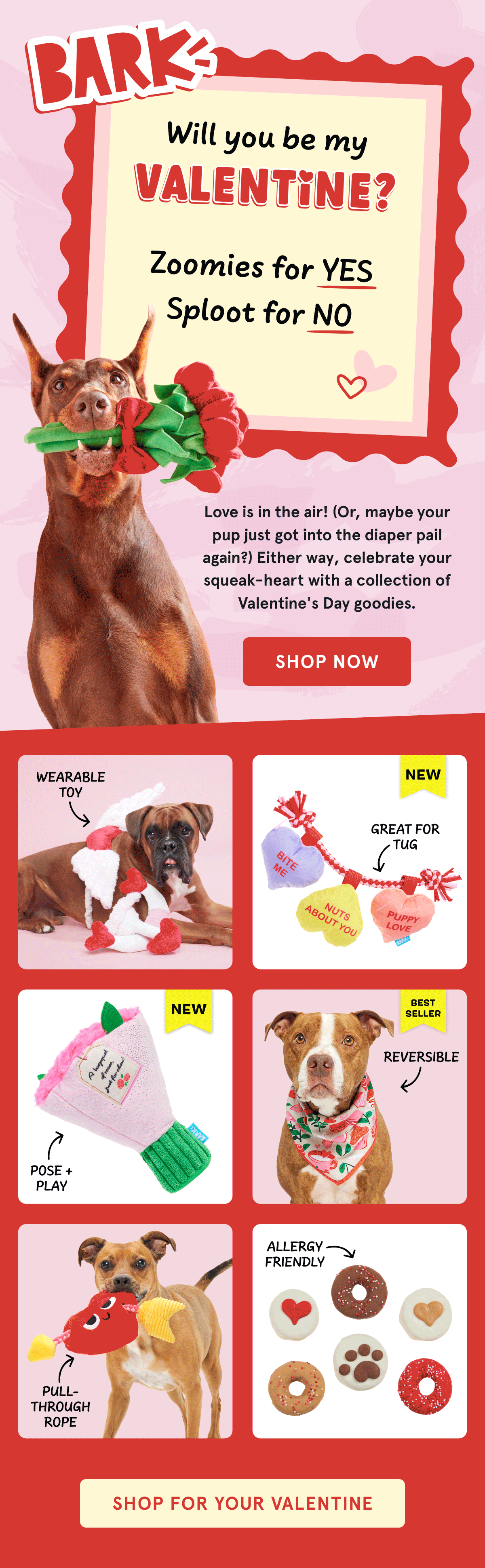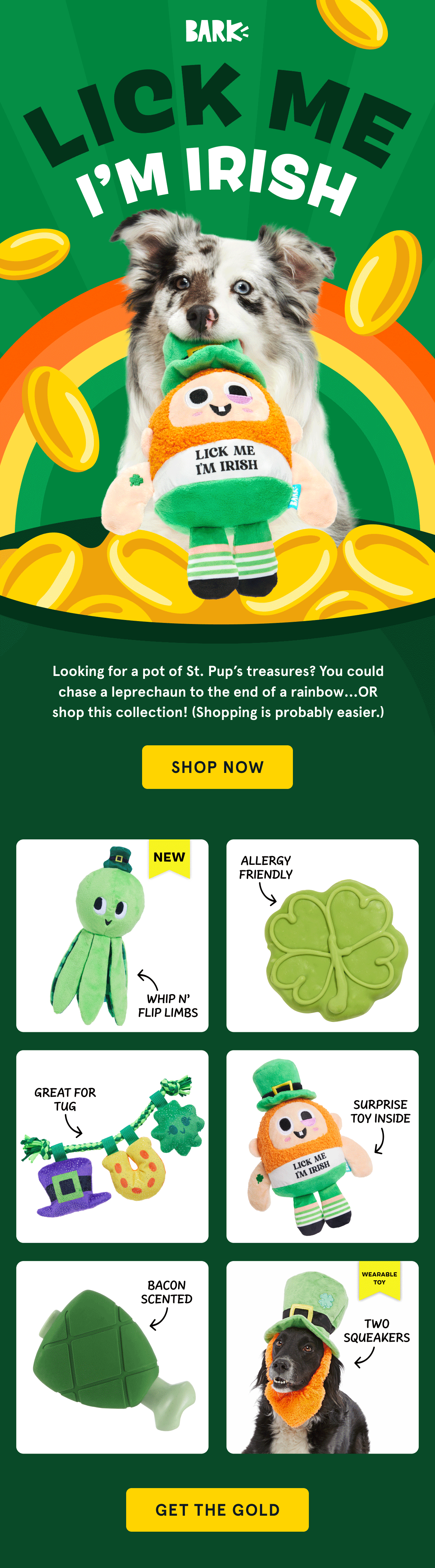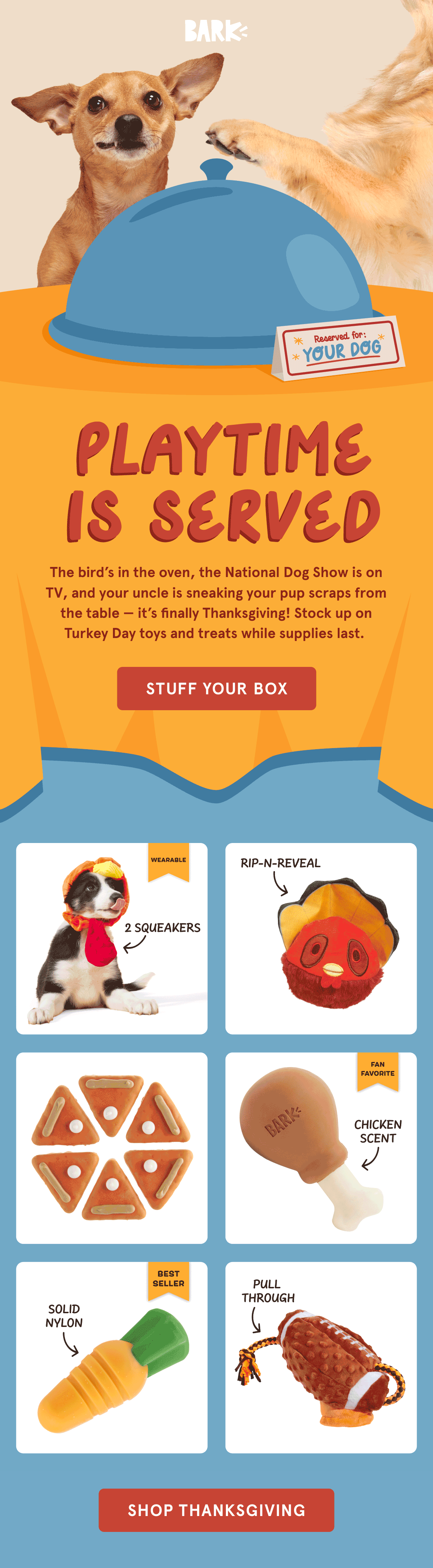 This email collection follows BARK’s standard 'Add to Box' grid layout, featuring themed headers designed with playful typography, bold color, and animated GIFs to capture attention and reinforce the toy line’s concept