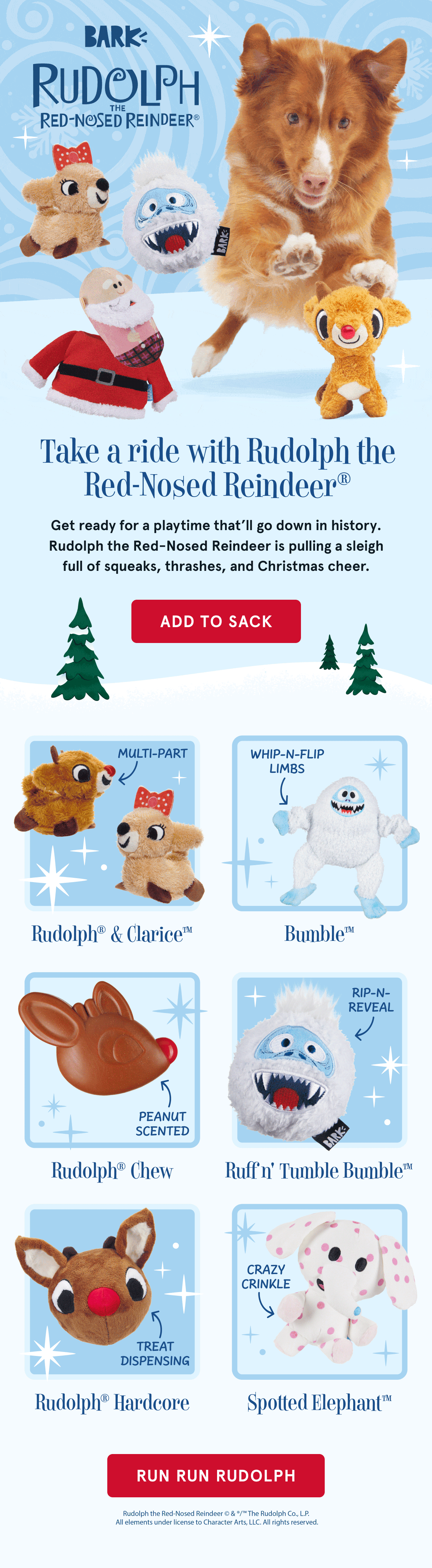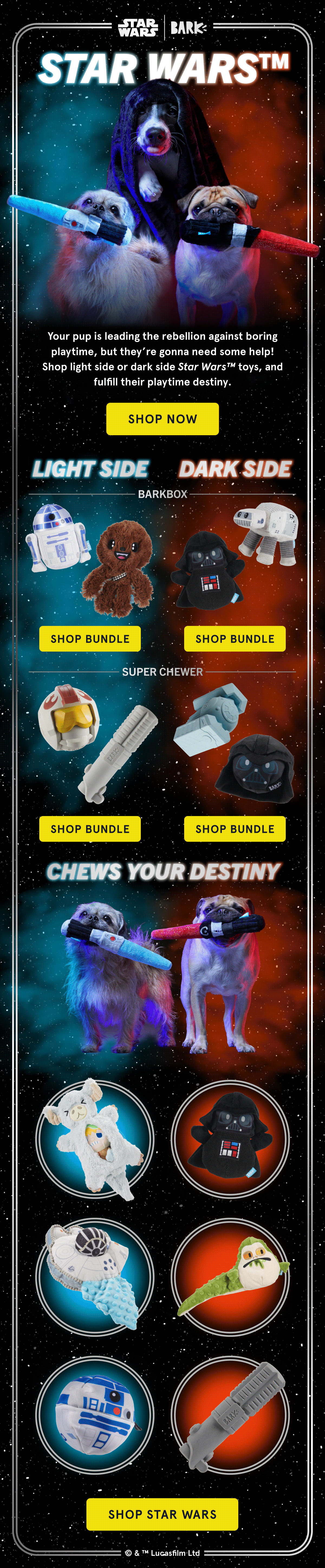 BARK partners with major brands like Star Wars, Rudolph, and Harry Potter to create specialty toy lines. For these collaborations, I work directly with licensing partners to ensure all marketing creative aligns with both BARK’s brand voice and the partner’s brand guidelines—adhering to requirements around copy, fonts, colors, legal language, and other restrictions.