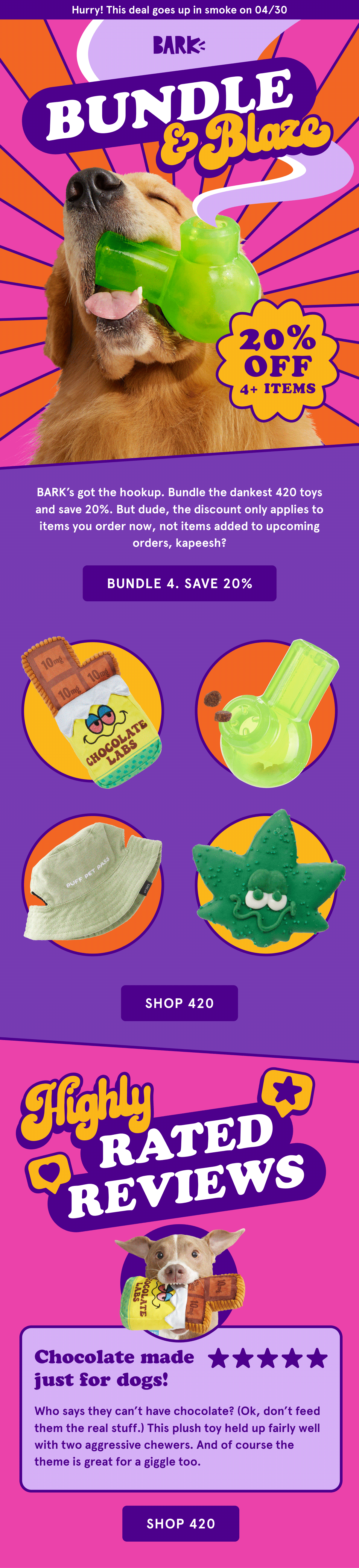 One of BARK’s most talked-about campaigns is our annual 420 Campaign. In the weeks leading up to April 20th, I help develop a range of creative assets—including emails, MMS content, site banners, and paid ads—distributed across all lifecycle marketing channels.