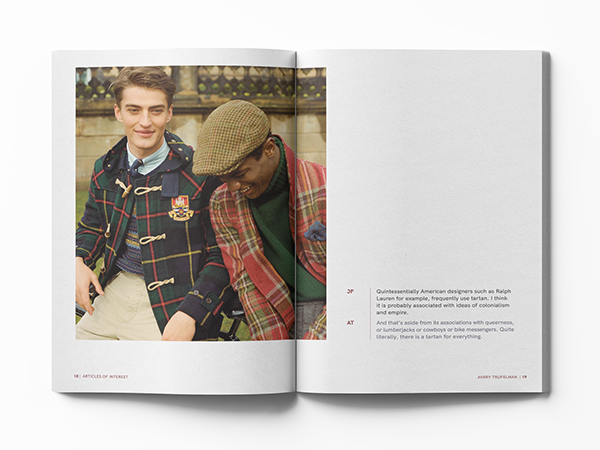This is a book I designed based on the "Articles of Interest" series from 99 Percent Invisible, a podcast by Roman Mars about "all the thought that goes into the things we don’t think about — the unnoticed architecture and design that shape our world." The host Avery Trufelman, along with guest speakers Anna Pulley, Peter Macdonald, Jonathan Faires, and Dee Williams, recount the history of plaid, or tartan, and discuss its role in society today.