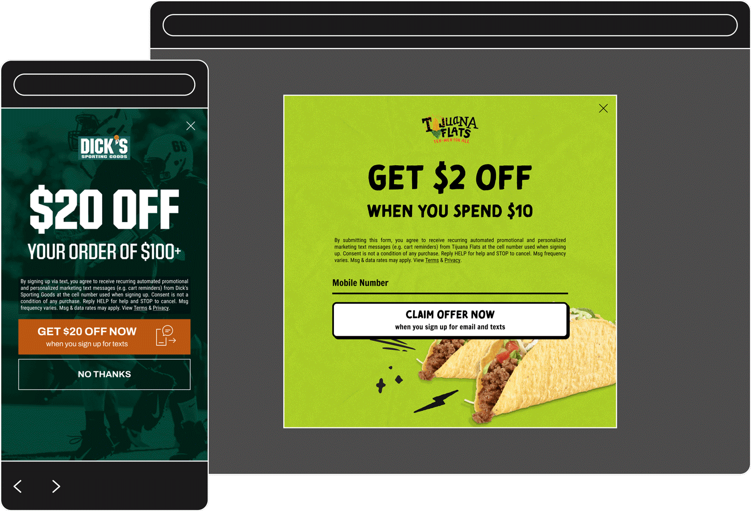 We offer two types of sign-up units for customers browsing on mobile devices: fullscreen sign up units (left) and partial sign up units (right). This is typically the first thing a customer will see upon entering a client’s site, so it’s especially important that these sign-up units match each brand’s unique visual aesthetic.